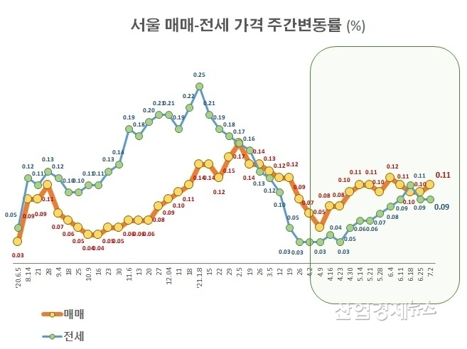 한편, 서울 아파트의 매매가격 상승세와 달리 전세가격은 두 주 연속 상승률이 줄었다. 6월 셋째 주에 재건축아파트 이주 수요 등으로 0.11%까지 상승률을 올렸던 서울의 전세가격 상승률은 6월 마지막 주에 이어 7월 첫째 주도 주간 상승률 0.09%에 머물렀다.