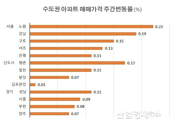 재건축 아파트들이 몰려있는 강남구, 서초구 아파트도 각각 0.19%, 0.13% 오르면서 수도권 가격 상승을 주도했다. 이들 지역은 상승률에서는 노원구 보다 낮았지만, 한 채에 20억원을 넘나드는 가격으로 인해 한 주만에 1억원이나 오른 것으로 조사됐다.