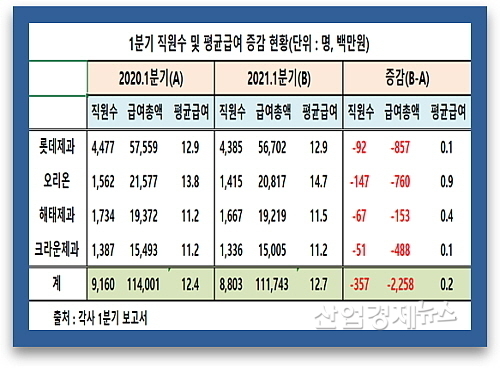 이를 각 사별로 살펴보면 평균급여 톱 오리온이 2020년 1분기 1562명에서 올 1분기 1415명으로 무려 147명이나 줄었고, 롯데제과가 4477명에서 4385명으로 92명, 해태제과가 1734명에서 1667명으로 67명, 크라운제과도 1387명에서 1336명으로 51명이 회사를 떠났다.
