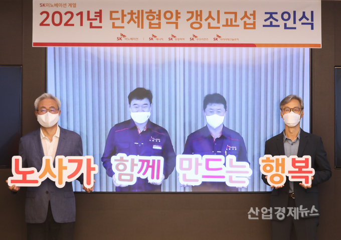 SK이노베이션은 22일 서울 서린동 SK빌딩과 SK이노베이션 울산Complex(이하 울산CLX)를 화상으로 연결해 ‘2021년도 단체협약 조인식’을 가졌다고 밝혔다. 이 자리에는 SK이노베이션 김준 총괄사장, SK에너지 조경목 사장, 이성훈 노동조합위원장을 비롯한 관련 임직원 등이 각각 참석했다.