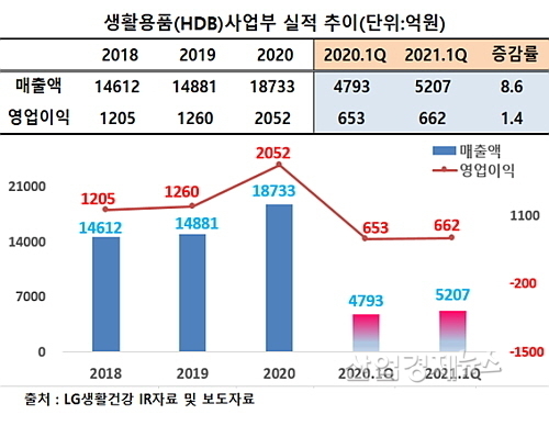 LG생활건강이 공시한 IR자료에 근거해 생활용품사업부의 최근 3년간 실적 추이를 살펴보면, 먼저 매출은 지난해 1조8733억 원을 시현, 2018년 1조4612억 대비 4121억이 늘어 28.2% 가량 성장했다.