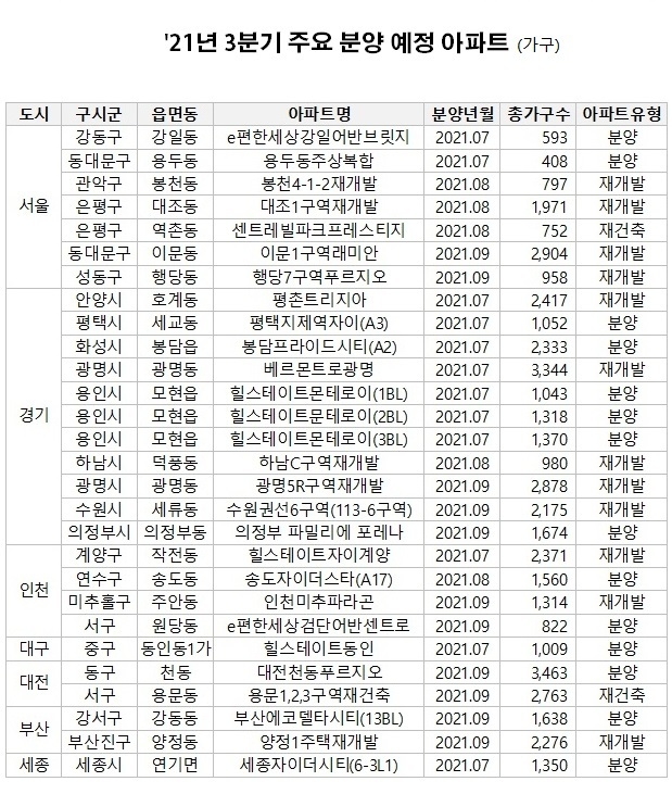 고덕강일 e편한세상강일어반브릿지가 593가구, 이문1구역래미안 2904가구, 행당7구역푸르지오 958가구, 은평 대조1구역 1971가구 등 강북권 재개발 단지들이 3분기에 나올 것으로 예상된다.