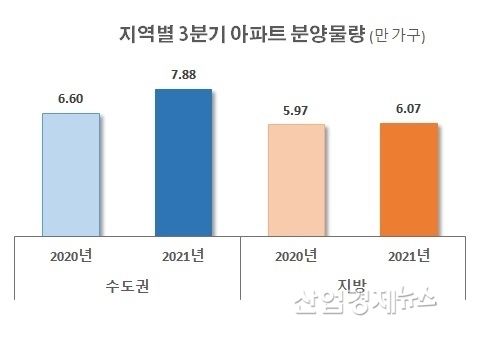 올해 3분기 분양 예정 아파트를 각 지역별로 살펴보면, 경기도가 5만 5574가구로 타 지역보다 월등히 많았고, 인천이 1만 2802가구로 뒤를 이었지만 경기도와의 물량 차이는 4배에 가까왔다.