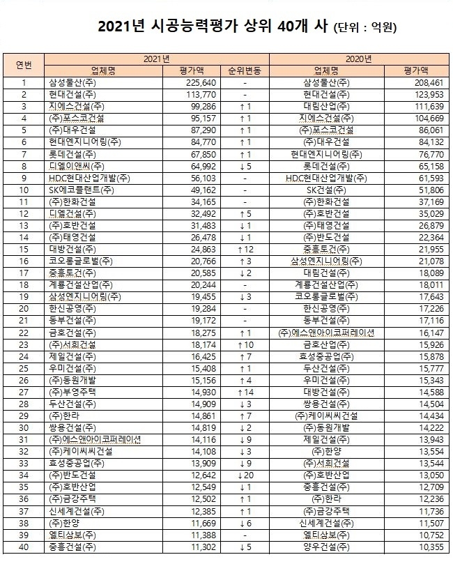 지난달 30일 국토부는 전국 건설업체를 대상으로 평가한 2021년도 시공능력평가 결과를 발표했다. 종합순위에서는 삼성물산이 22조 5640억원으로 1위를 하면서 8년 연속 1위를 지켰다. 2위는 현대건설이 11.4조원, 3위는 지난해 4위를 기록했던 GS건설이 9.9조원의 시공능력을 인정받았다.