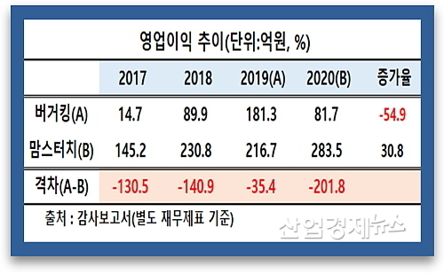 외형과 달리 손익에서는 맘스터치가 버거킹을 압도하는 우위의 성적표를 만들어냈다.
