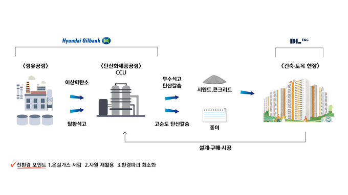 DL이앤씨와 현대오일뱅크는 충남 서산시 현대오일뱅크 대산 공장에서 가동 중인 정유시설에서 발생하는 부산물인 탈황석고와 이산화탄소를 활용한 탄산화제품 생산공장을 건설할 계획이다. 탄산화제품은 시멘트와 콘크리트 등 건축 자재의 원료로 사용된다.