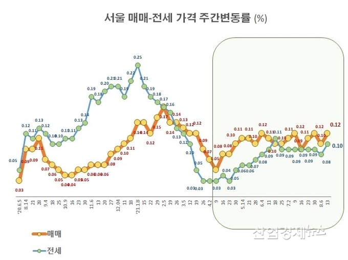 서울 전세가격은 6월부터 7월까지 주간상승률 0.09%에 머물러 있었지만, 8월 첫째주 0.08%로 다소 축소되는 듯 하다가 지난주에는 0.10%로 오히려 이전보다 더 높은 상승률을 보였다.