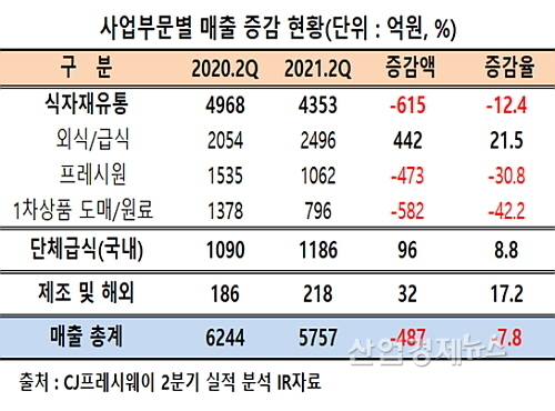 CJ프레시웨이가 최근 공시한 2분기 잠정 실적(연결기준)에 따르면 먼저 매출은 전년 동기 대비 7.8% 감소한 5757억 원, 영업이익은 무려 605.3%나 급증한 191억 원을 각각 기록했다.