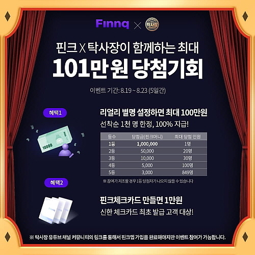 이벤트 관련 자세한 내용은 유튜브 '탁재훈의 탁사장' 채널 커뮤니티와 핀크앱에서 확인 가능하다.