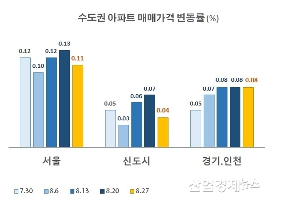 수도권 아파트가격을 매주 조사하고 있는 부동산114에 따르면, 지난 한 주 사이에 수도권 아파트 가격의 주간상승률이 서울의 경우에는 0.13%에서 0.11%로 축소됐고, 신도시는 0.07%에서 0.04%로 줄어 든 것으로 조사됐다. 경기인천 지역은 3주 째 0.08%를 유지하고 있다.