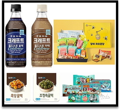 더불어 다채로운 식감과 맛의 과자를 한 번에 즐길 수 있는 간식 박스도 나왔다. 온라인 전용 상품으로 출시된 CJ프레시웨이의 간식박스 ‘당이 차오른당’ 간식 세트에는 견과류로 만든 스낵 및 팝콘, 유산균음료 등 자체 브랜드 이츠웰의 스낵, 음료 상품 11종이 담겼다.
