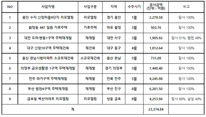 재개발∙재건축 등 정비사업과 더하면 8월말 기준 총 2조 3,375억원을 수주고를 기록하며 도시정비사업부문 3년 연속 수주 2조원 달성이라는 의미 있는 기록을 작성하게 됐다.