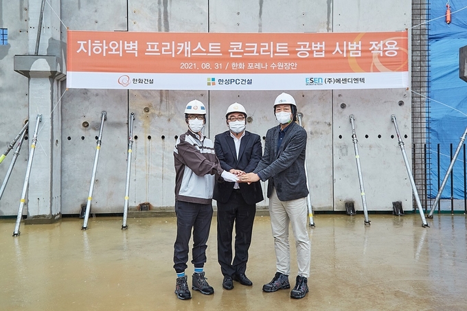지하외벽 PC공법은 한화 포레나 수원장안 아파트 106동 인근 지하주차장 2개 경간(16M), 총 9개 부재를 목업(시험) 시공하였으며, 이 자리에는 윤용상 한화건설 건축사업본부장, 이진섭 한성PC건설 영업시공본부장, 류종우 에센디엔텍 대표 등 관계자들이 직접 참관하였다.