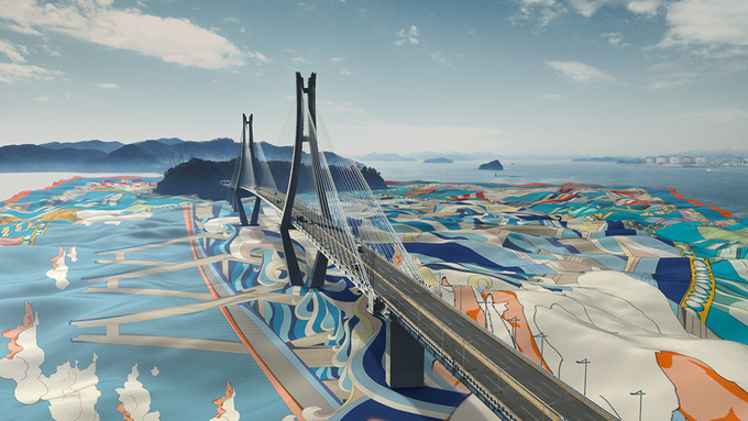 또 다른 스카프는 대우건설의 건축물이 그려져 있다. 교각이나 플랜트 이미지를 패턴 디자인으로 고급스럽게 구성한 부분이 흥미롭다. 스카프 중앙에는 ‘거가대교’를 배치하고 주변에는 플랜트를 상징하는 LNG 저장탱크, 파이프 등이 마치 명품 스카프의 디자인 패턴처럼 감각적으로 그려져 있다.
