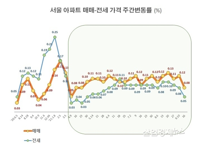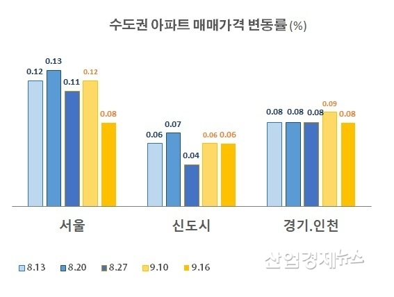 서울 아파트값의 주간상승률은, 지난 4월 지방자치단체장 선거 이후 0.10~0.13%로 높이 치달았지만 추석을 앞둔 9월 16일 조사에서 0.08% 로 축소된 것으로 조사됐다. 5개월만에 0.10% 아래로 하락했다.