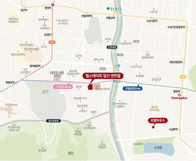 ‘힐스테이트 앞산 센트럴’은 인근으로 다양한 개발 호재들이 예정돼 있다. 단지 서측으로는 대구 3차 순환도로 미개통 구간 중 동편도로 700m가 지난해 반환되었고 정화 작업 완료 후 착공할 예정이다. 뿐만 아니라 트램 순환선(계획)도 대구광역시에서 추진중인 사업으로 대구 주요 지역을 순환하게 되어 수성구는 물론 대구 전역으로의 접근성이 크게 향상될 것으로 기대된다.