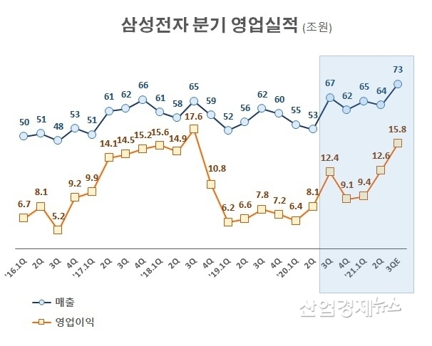 삼성전자는 올해 3분기에 매출 73조원, 영업이익 15.8조원이 예상된다고 잠정실적을 발표했다. 지난해 3분기와 비교해보면 매출은 9.0% 증가했지만, 영업이익은 27.9% 증가하며 30% 가까운 증가세를 보였다.