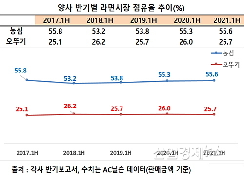 각사 반기보고서와 시장조사기관 AC 닐슨에 따르면 올 상반기 양사의 국내 라면시장 점유율은 판매금액 기준 농심이 55.6%로 전년 동기 55.3% 대비 0.3%% 포인트 신장했다.