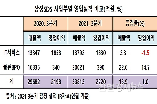 반면, IT서비스부문 매출 증가율은 3.3%를 시현, 물류BPO 22.6%의 약 7분의1 수준에 그치는 초라한 양상을 보였다.