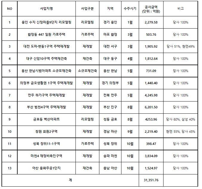 현대건설은 올해 용인 수지 신정마을9단지 리모델링 사업 단독 수주를 시작으로 ▲마포구 합정동 447 일원 가로주택, ▲대전 도마·변동1구역 재개발, ▲대구 신암10재정비촉진구역 재건축, ▲용산구 한남시범아파트 소규모재건축, ▲의정부 금오생활권1구역 재개발, ▲전주 하가구역 재개발, ▲부산 범천4구역 재개발, ▲성동구 금호동 벽산아파트 리모델링, ▲창원 회원2구역 재개발, ▲성북구 장위11-1구역 가로주택, ▲송파구 마천4재정비촉진구역 재개발, ▲아산 용화주공1단지 재건축 등 총 13개 사업지의 시공권을 획득하며 3조 1,352억원의 수주고를 기록하고 있다.