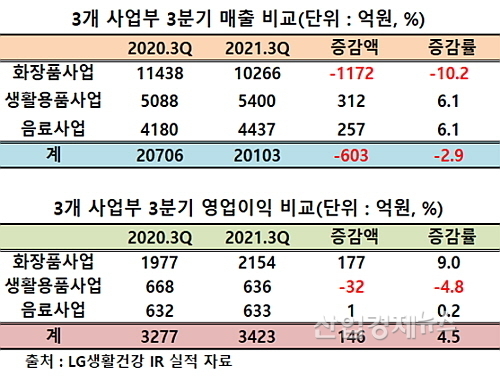 LG생활건강이 밝힌 연결재무제표 기준 올 3분기 잠정실적(IR자료)에 따르면 전사 3분기 매출은 2조103억 원으로 전년 동기 2조706억 대비 603억이 줄어 2,9% 가량 감소했다. 이는 코로나19 초기인 2020년 2분기에 기록했던 1조7832억 원 이후 5분기 만에 가장 적은 수치다.