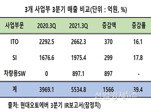 이에 대해 현대오토에버 관계자는 “3분기 SI 사업 매출은 지난해 같은 기간 대비 17.8% 증가한 1975억, ITO 사업 매출은 지난해 같은 기간보다 16.1% 늘어 2662억 원을 기록했고 4월1일자 합병으로 추가된 차량 소프트웨어(SW) 부문에서 897억 원의 매출이 가세하며 전사 외형성장을 이끌었다”고 설명했다.