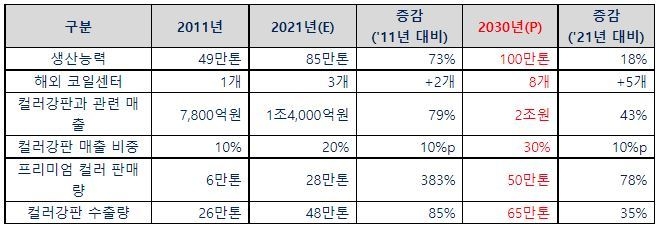 이러한 계획은 컬러강판 매출 비중을 현재 20%에서 30%까지 성장시킨다는 중장기 목표이며, 특히 컬러강판 글로벌 판매량 65만톤(10년내 35% 확대), 프리미엄 제품 판매 50만톤(10년내 78% 확대)의 목표를 제시했다.