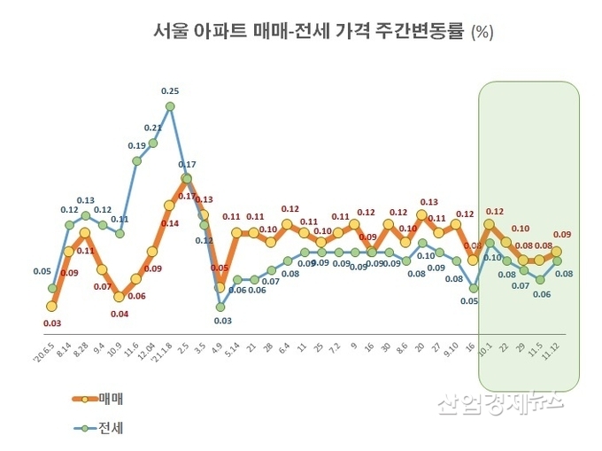 11월 첫째주에는 금융규제로 인한 매수세 감소에도 불구하고 재건축 아파트들의 가격상승이 맞서면서 0.08%를 유지했다.