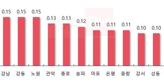 지난 주 서울 각 지역별로 상승세가 높았던 곳을 살펴보면, 재건축 기대감이 높은 강남구와 강동구 그리고 노원구가 0.15%의 주간상승률을 보이며 가장 높은 상승률을 기록했다.