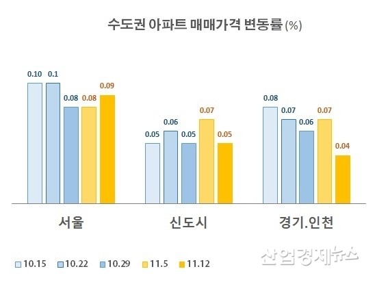 한편, 11월 첫째주 서울의 상승세가 주춤하면서 상대적으로 상승세가 확대됐던, 신도시와 경기인천 지역의 아파트값 상승률은 지난주에 큰 폭으로 감소했다.