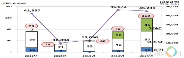 (미디어온) 정부의 IPO활성화 정책 등으로 2015년 IPO시장은 2014년 대비 46개사 증가한 118개사가 신규상장하면서 4.5조원을 조달한 것으로 나타났다.