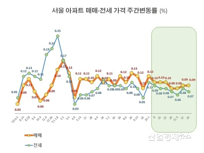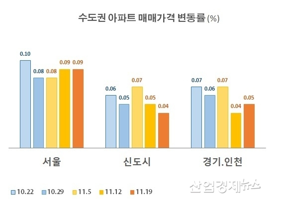 매주 수도권 아파트 가격을 조사해 발표하는 부동산114의 데이터를 살펴보면, 서울 아파트가격의 주간상승률은 지난 10월 8일 0.10%를 기록한 후 0.08%로 잠깐 줄었다가 11월 둘째주와 셋째주는 0.09%로 다소 상승률이 커졌다.