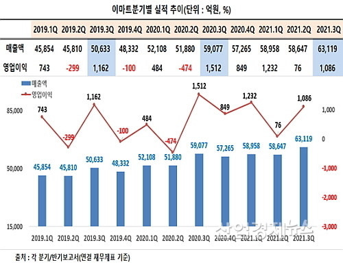이마트 분기보고서와 증권가에 따르면 먼저 연결재무제표기준 올 3분기 매출은 지배기업 이마트와 주요 종속기업의 고른 성장에 힘입어 전년 동기 5조9077억 대비 6.8% 가량 신장한 6조3119억 원을 시현, 창사 이래 최초로 분기 매출 6조 원 시대를 개척하는 선전을 펼쳤다.