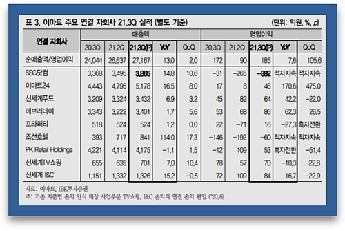 김명주 한국투자증권 연구원은 “직원들 백신 휴가에 따른 시간제 직군 채용으로 인건비가 200억 원이 증가한데다 할인점의 재난 지원금 사용처 제외 영향에 따른 부진과 쓱닷컴의 점유율 확대를 위한 판촉비용 증가가 손익에 악 영향을 미쳤다”고 분석했다.