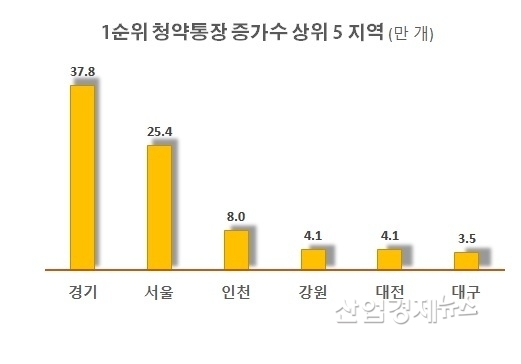 1순위 청약통장 수가 가장 많이 늘어난 상위 5개 지역을 살펴보면, 경기도가 올해 들어 10월까지 37.8만개가 늘어났으며, 서울이 25.4만개, 인천이 8만개가 늘어나는 등 수도권이 1~3위를 차지했고, 강원 4.1만개, 대전 4.1만개, 대구 3.5만개로 뒤를 이었다.