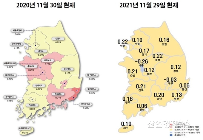 지역별로 보면, 수도권은 0.16%로 작년과 비슷한 상태를 유지하고 있지만 지방은 지난해 0.31%에서 올해는 0.13%로 큰 폭으로 하락하면서 완전히 다른 시장이 됐다.
