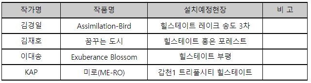 이 공모전으로 최종 선정된 작품은 김경일 작가의 ‘Assimilation-Bird’, 김재호 작가의 ‘꿈꾸는 도시’, 이대송 작가의 ‘Exuberance Blossom’ 마지막으로 KAP 팀의 ‘미로(ME-RO)’ 이다.