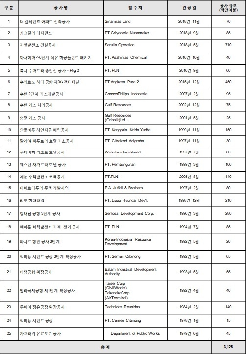 한편, 현대건설은 지난 1973년 자고라위 유료도로 공사로 인도네시아에 첫발을 내딛은 후 사룰라 지열발전소, 수카르노 하따 공항 제 3터미널, 더 엘리먼츠 아파트 등을 포함한 총 25개 공사(총 31억불 규모)를 완공하였으며, 현재는 푸상안 수력 발전소 등 2개 공사를 수행 중으로 인도네시아 시장에서의 경쟁력을 유지·확대 중이다.