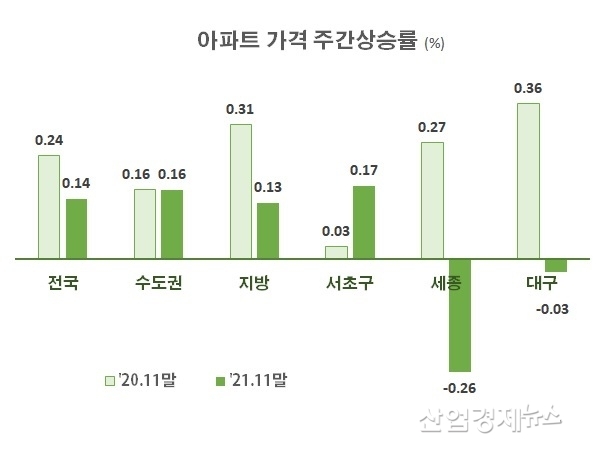 지난주 세종시는 -0.47%로 하락세가 더 급박해졌으며, 대구시는 -0.03%의 하락세를 그대로 유지하고 있다.