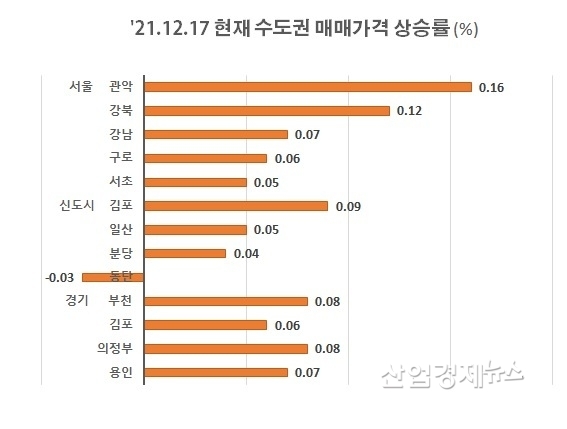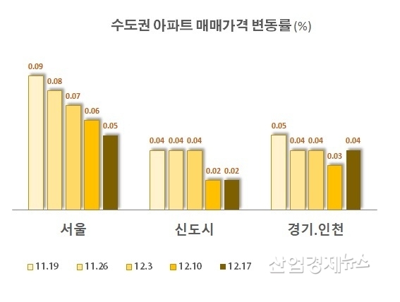 부동산114의 자료에 따르면, 서울의 주간상승률은 한달전 0.09%에서 0.05%까지 줄곧 감소한 반면, 경기인천 지역은 한달전 0.05%에서 0.03%까지 줄었다가 지난주 다시 0.04%로 반등했다.