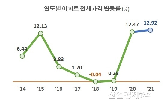 전세 아파트값은 공급물량이 크게 감소한 2020년, 2021년에 크게 올랐다. 2020년 전세값 상승률은 12.47%, 올해는 이보다 더 상승한 12.92%의 상승률을 기록했다.