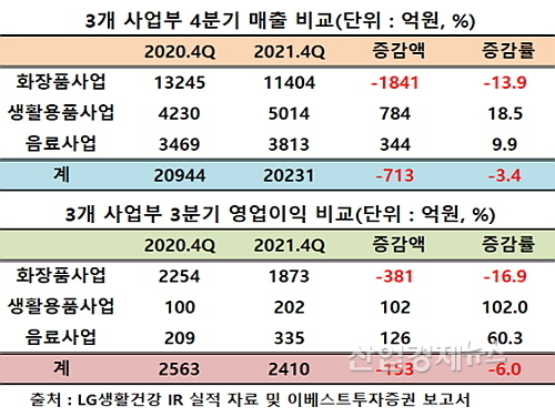 3대 사업부별 4Q 실적 ‘화장품 부진, 생활용품·음료는 선전’