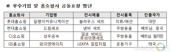 해외홈쇼핑 방송지원사업은 2013년부터 중소기업청, 대·중소기업협력재단, 롯데홈쇼핑, 현대홈쇼핑, CJ오쇼핑, GS홈쇼핑이 함께 대․중소기업 동반 해외진출 지원의 일환으로 추진해 왔으며, 대기업이 해외에 구축한 홈쇼핑 플랫폼을 활용하여 중소기업 제품이 방송될 수 있도록 제품현지화 및 인서트 동영상 제작비용 등을 지원하고 있다.