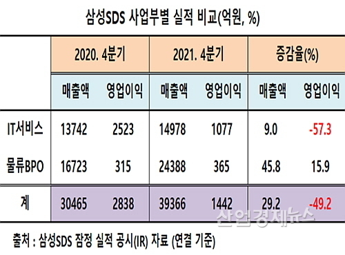 먼저 IT서비스부문의 지난해 4분기 영업이익은 1077억 원을 시현, 전년 동기 2523억보다 1446억이나 급감해 무려 57.3%나 역주행 했다.