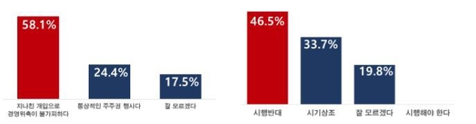 전경련은 또 최근 논란이 되고 있는 사회 이슈에 대한 ESG 담당자들의 인식을 조사했다. 주주대표소송에 대해 어떻게 생각하느냐는 질문에 대해서는 ‘지나친 개입으로 기업경영 위축이 불가피할 것’이란 응답이 58.1%로 ‘통상적인 주주권 행사’란 응답(24.4%)의 두 배가 넘었다. 노동이사제 확산에 대한 인식을 묻는 질문에는 ‘도입반대’(46.5%) 또는 ‘시기상조’(33.7%)란 응답이 80.2%에 달했다.