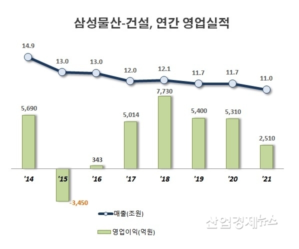 삼성물산 건설부문은 2014년 14.9조원의 매출을 보인 이후 해마다 매출이 감소해서 2021년에는 11조원까지 매출이 줄어들었다. 26.7%가 감소했다.
