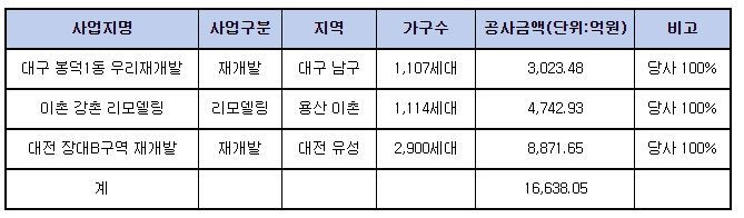[엔트로피타임즈 최기훈 기자] 현대건설이 용산 이촌동 강촌아파트 리모델링사업과 대전 유성구 장대B구역 재개발사업의 시공권을 확보하며 올해 1조 6,638억원의 수주고를 달성했다. 지난해에는 5월에 수주 1조원을 돌파했다.