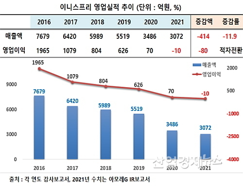 이니스프리의 지난해 매출은 3072억 원으로 전년도 3486억 대비 11.9% 또 줄었고, 손익 상황은 더 심각해 10억 원의 영업결손을 기록 적자로 반전됐다.