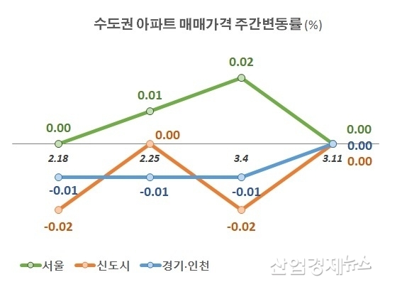 경기인천지역도 -0.01%의 약한 하락세를 유지하고 있었지만 지난주에는 0.00%를 기록하며, 서울, 신도시와 마찬가지로 가격 움직임이 멈췄다.