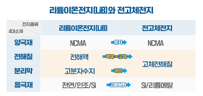 전고체전지는 리튬이온전지(LiB, Lithium-ion battery)의 4대 소재인 양·음극재, 전해질, 분리막 중 전해액과 분리막을 고체상태의 이온전도 물질로 대체한 차세대 전지로 2030년부터 시장이 본격 성장할 것으로 기대되고 있다.